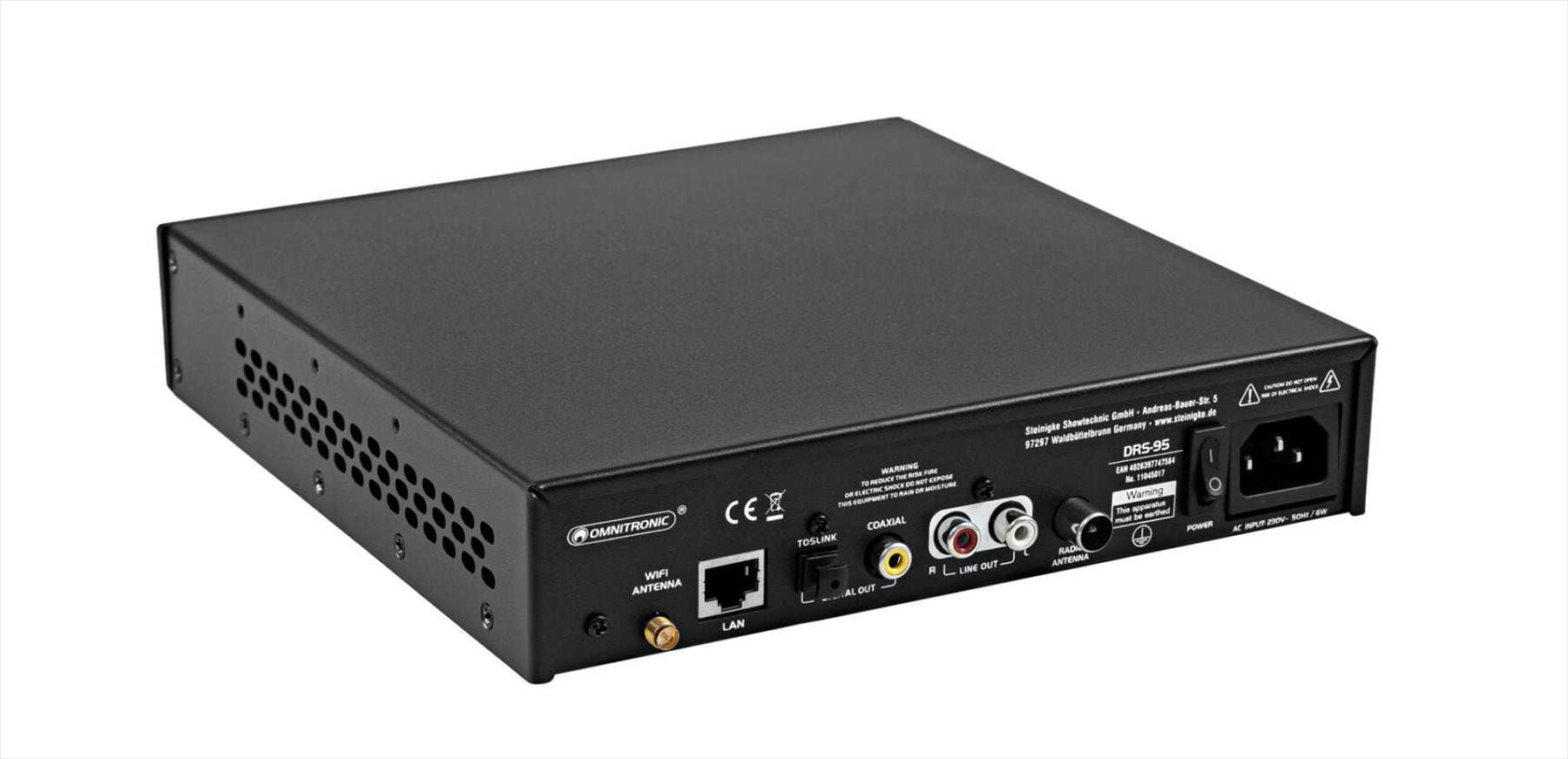 Connections: Antenna input via 1 × Belling-Lee (M), 1 × SMA (M); line output via 1 × stereo RCA; coaxial output (S/PDIF) via 1 × RCA (F); optical output via 1 × Toslink