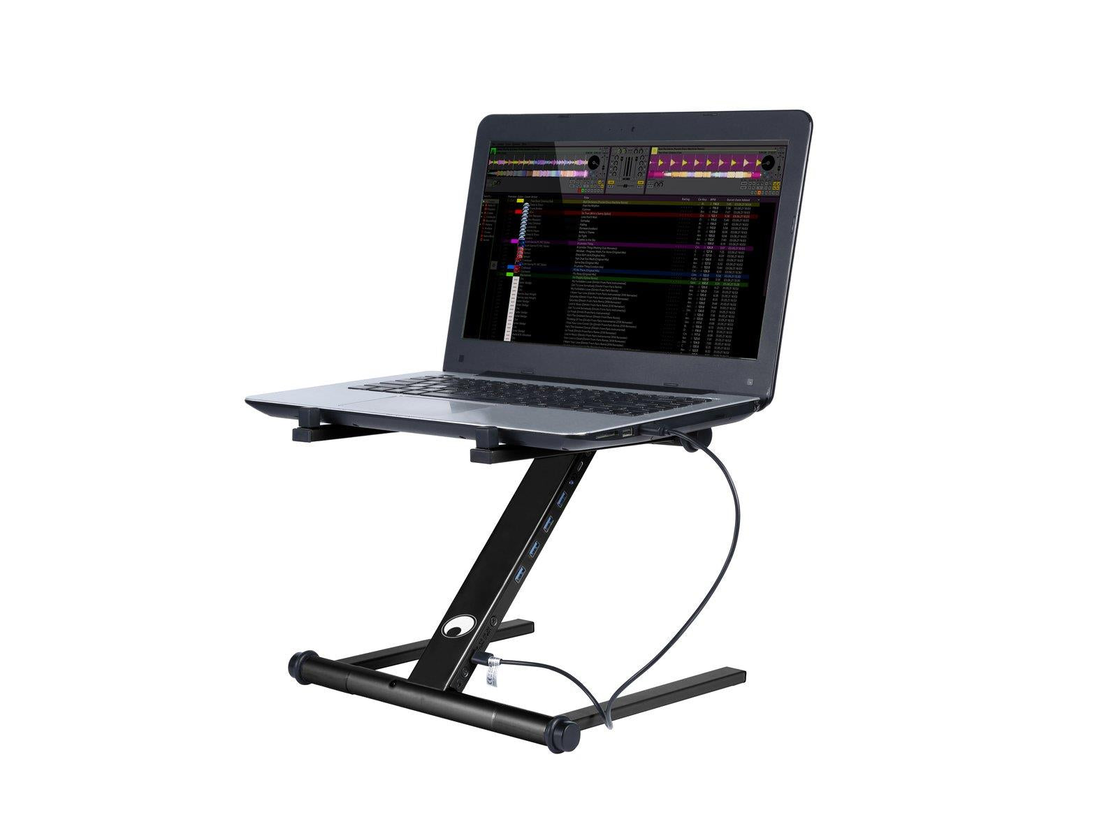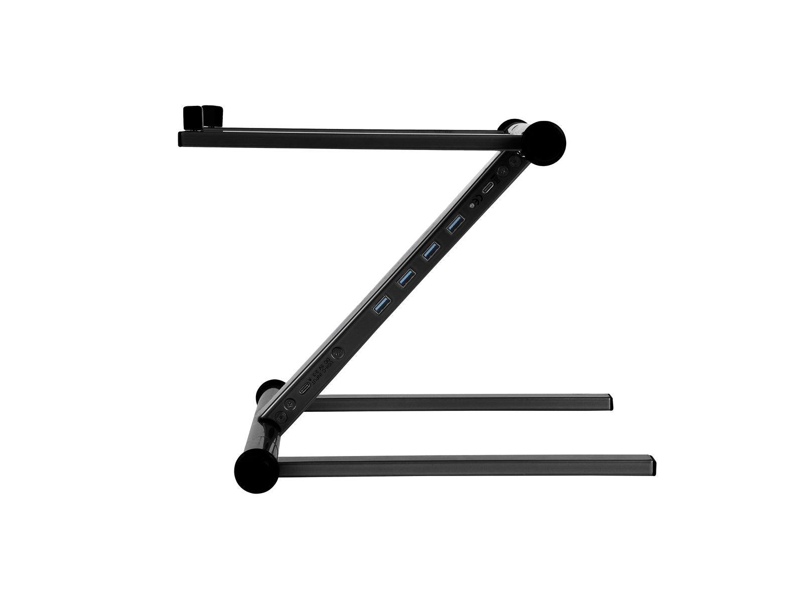 The SLR-USB is a professional laptop stand with integrated USB hub DJ setups. The lightweight and foldable steel frame fits all standard laptop sizes from 11"-18", tablets, controllers etc. The advanced design allows you to set up the stand in 5 different positions. The stand features a USB-C PD port (3.2 Gen 1, SuperSpeed PD5) to directly power the MacBook Pro and laptops with USB-C power ports. The 4 additional USB ports are used to connect USB peripherals. The ports comply with the USB 3.2 standard, are downward compatible and offer fast data transfer with SuperSpeed support. The stand is designed for a load of up to 60 watts; to ensure a stable power supply for all devices, it should always be operated in active mode with a USB power supply. Delivery includes a practical transport bag, as well as USB cables.