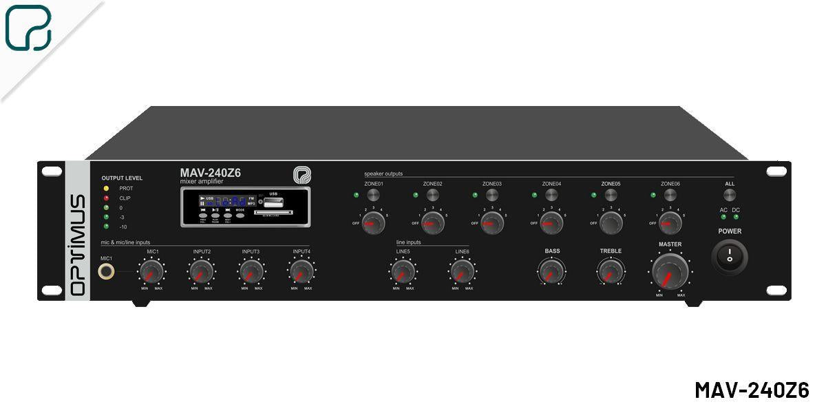 240W RMS amplifier with 6 x 100 V speaker outputs with independent volume. It incorporates six general audio inputs, one emergency input and one input for microphone desks with zone control. It has a music source with MP3 via UBS and SD, FM radio and Bluetooth. Includes clip, short circuit, overload and high-temperature protection, and LED indicators for power, signal, peak and protection.