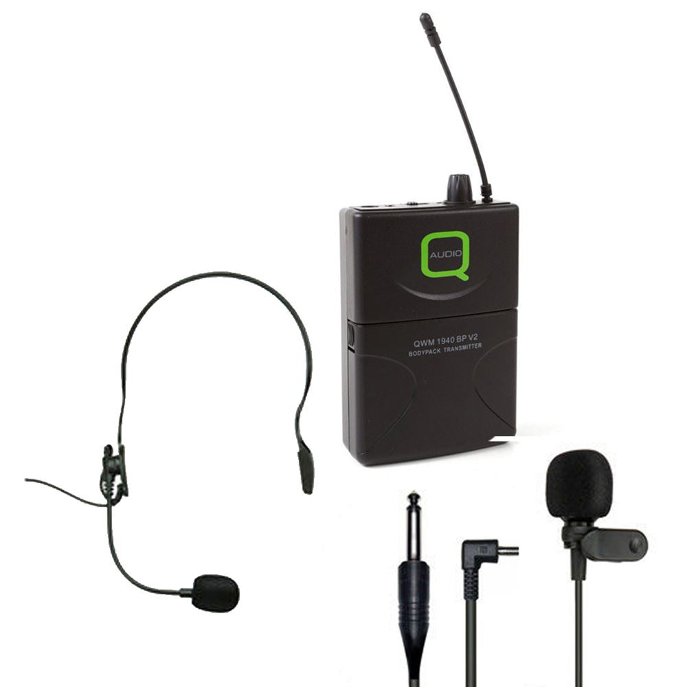 UHF Bodypack Transmitter with lavalier mic, instrument cable and headset microphone