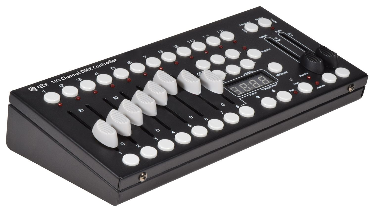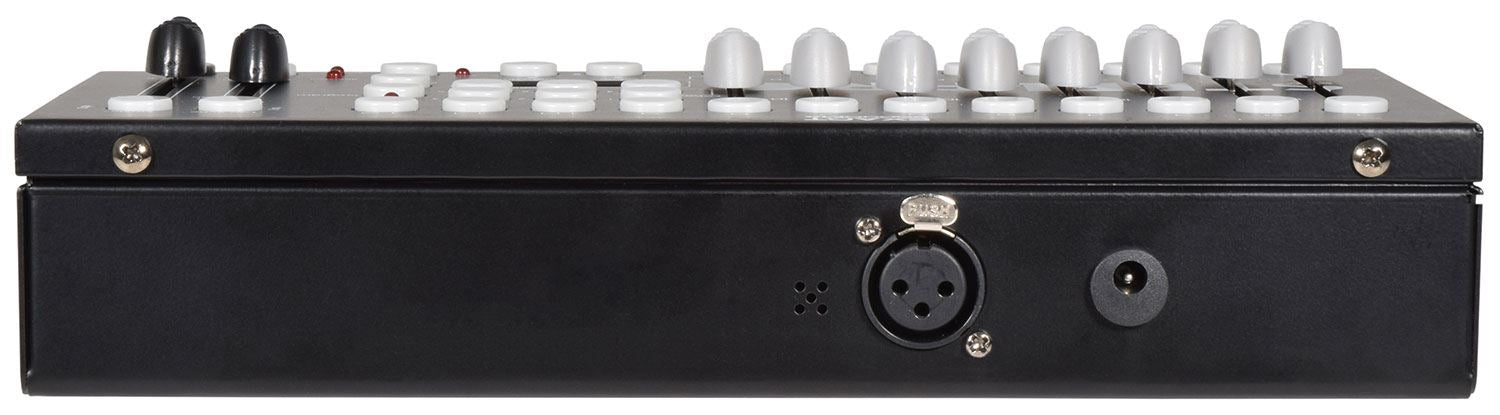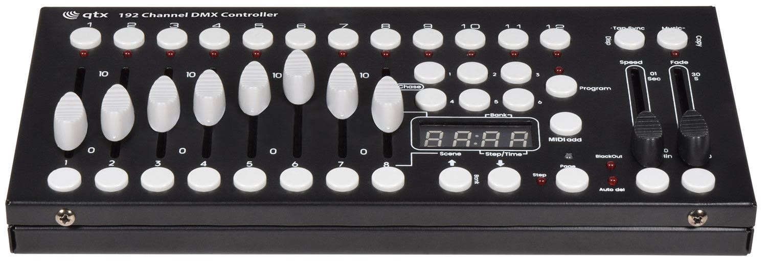 A small yet versatile 192 channel DMX controller with 12 fixtures. Each fixture controls up to 16 channels per unit. There are 23 programmable bank buttons each holding 8 scenes. These scenes can be programmed into 6 chase sequences each holding up to 240 scenes which can be triggered by sound, manually by tap or automatically by the time faders between 0.1 seconds and 10 minutes. A lightweight and portable controller, ideal for small theatres or stage applications.