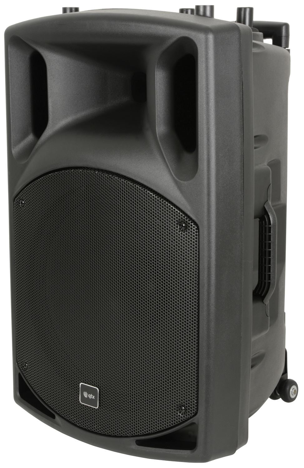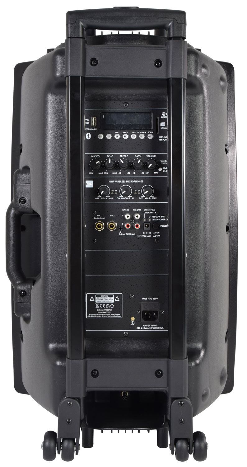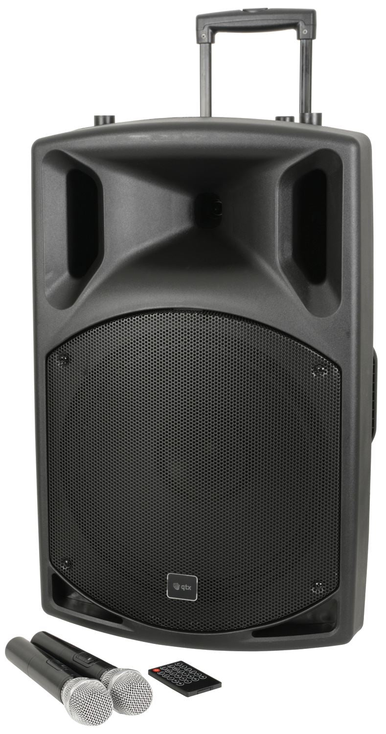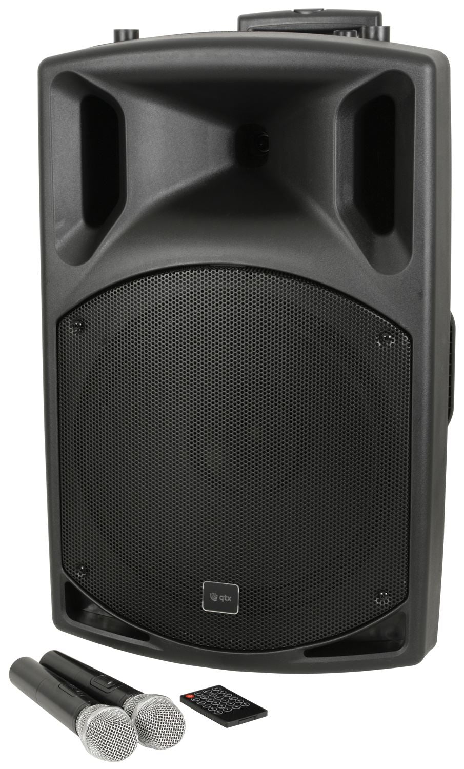 Complete portable PA unit in a QX-series cabinet. Built-in amplifier operating from mains or internal rechargeable battery powering a main driver and compression driven horn unit. 2 x UHF handheld wireless microphones are included with the receiver built into the rear panel along with 2 further mic inputs, auxiliary line input and Bluetooth receiver. Internal audio source is provided by an integral USB/SD/FM media player. A moulded handle and pole mount are included and a retractable trolley handle and rear wheels provide easy portability.