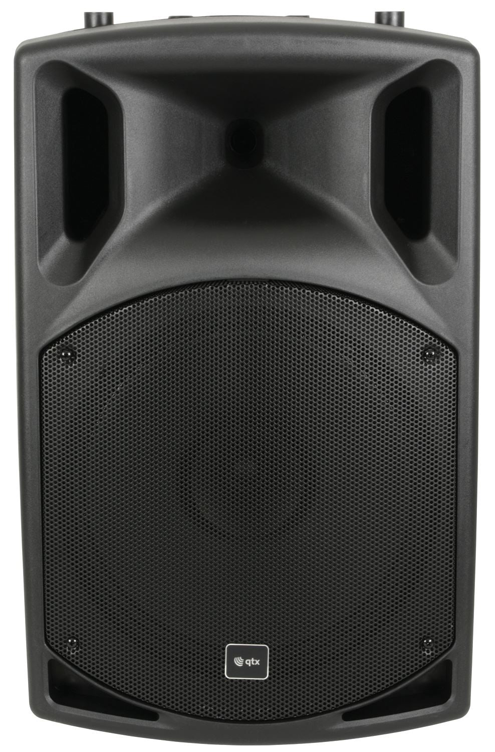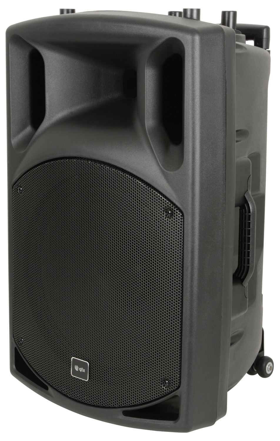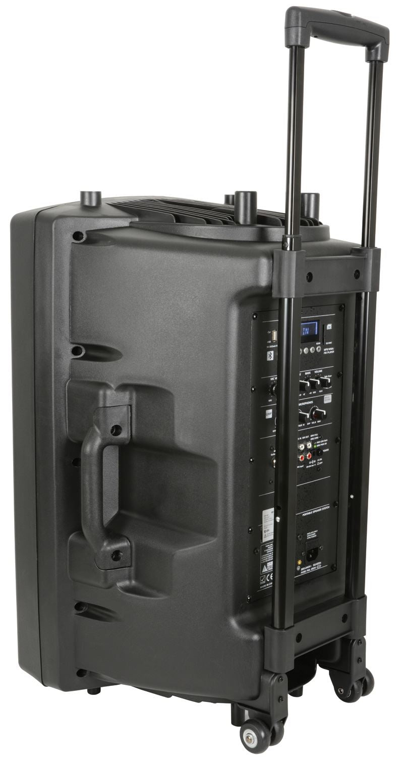 Complete portable PA unit in a QX-series cabinet. Built-in amplifier operating from mains or internal rechargeable battery powering a main driver and compression driven horn unit. 2 x UHF handheld wireless microphones are included with the receiver built into the rear panel along with 2 further mic inputs, auxiliary line input and Bluetooth receiver. Internal audio source is provided by an integral USB/SD/FM media player. A moulded handle and pole mount are included and a retractable trolley handle and rear wheels provide easy portability.
