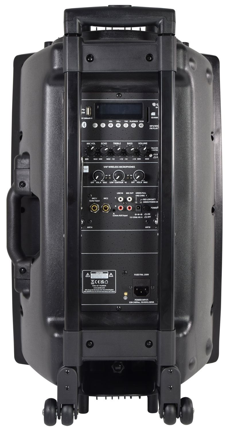 Complete portable PA unit in a QX-series cabinet. Built-in amplifier operating from mains or internal rechargeable battery powering a main driver and compression driven horn unit. 2 x VHF handheld wireless microphones are included with the receiver built into the rear panel along with 2 further mic inputs, auxiliary line input and BluetoothTM receiver. Internal audio source is provided by an integral USB/SD/FM media player. A moulded handle and pole mount are included and a retractable trolley handle and rear wheels provide easy portability.