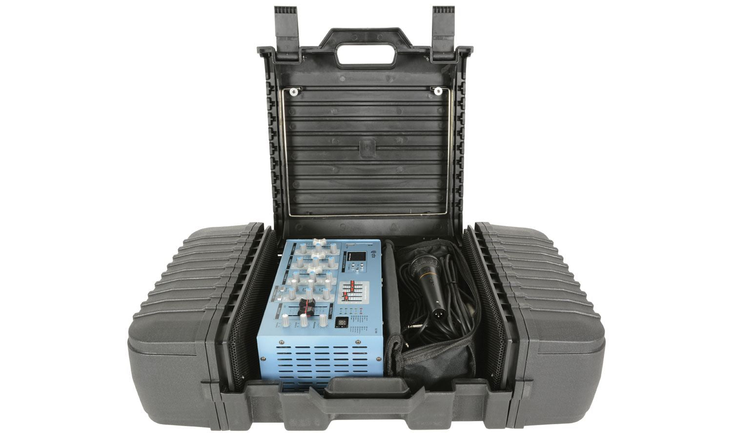A suitcase style PA set comprising a powered mixer and 2 speakers with tripod stands. The case opens to reveal the mixer and amplifier section, which has 2 balanced microphone inputs, 1 unbalanced mic/line input and a stereo line input channel. There are stereo or mono line outputs and a headphone output in addition to left & right jack speaker outputs.