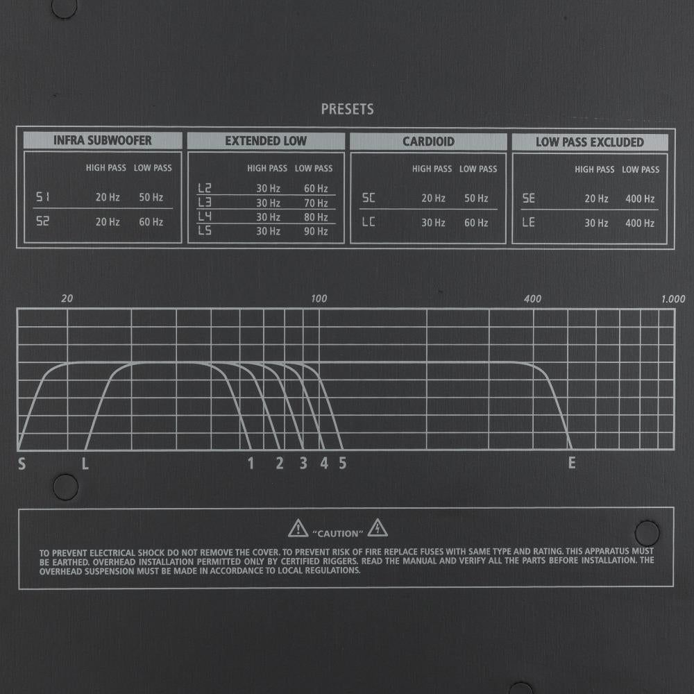 The amplifier integrates a low-noise 32-bit DSP circuit, controlled through the RCF proprietary RDNet network to easily handle the soft clipping limiters, RMS limits, polarity, amplitude, timing and equalisation. All the settings, monitoring and advanced features are available inside the RDNet Networked Management software. The available control panel on the back adjusts input sensitivity, Low Cut, Xover, volume, bypass, delay and presets selection. The regulated power supply guarantees full power from 100 V to 260 V. The amplifier houses on a unique Vibrostop floating aluminum panel for extra protection during transportation.