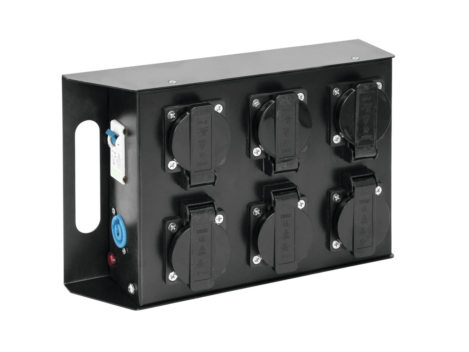 Power output: | 6 x Safety contact (F), hinged lid mounting version fused 1 x P-Con (gray), mounting version Bypass |