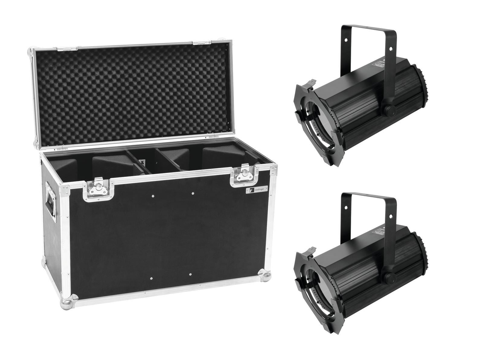 2x Fresnel spot, 100 W warm white LED, CRI >90, quiet, DMX including PRO flightcase