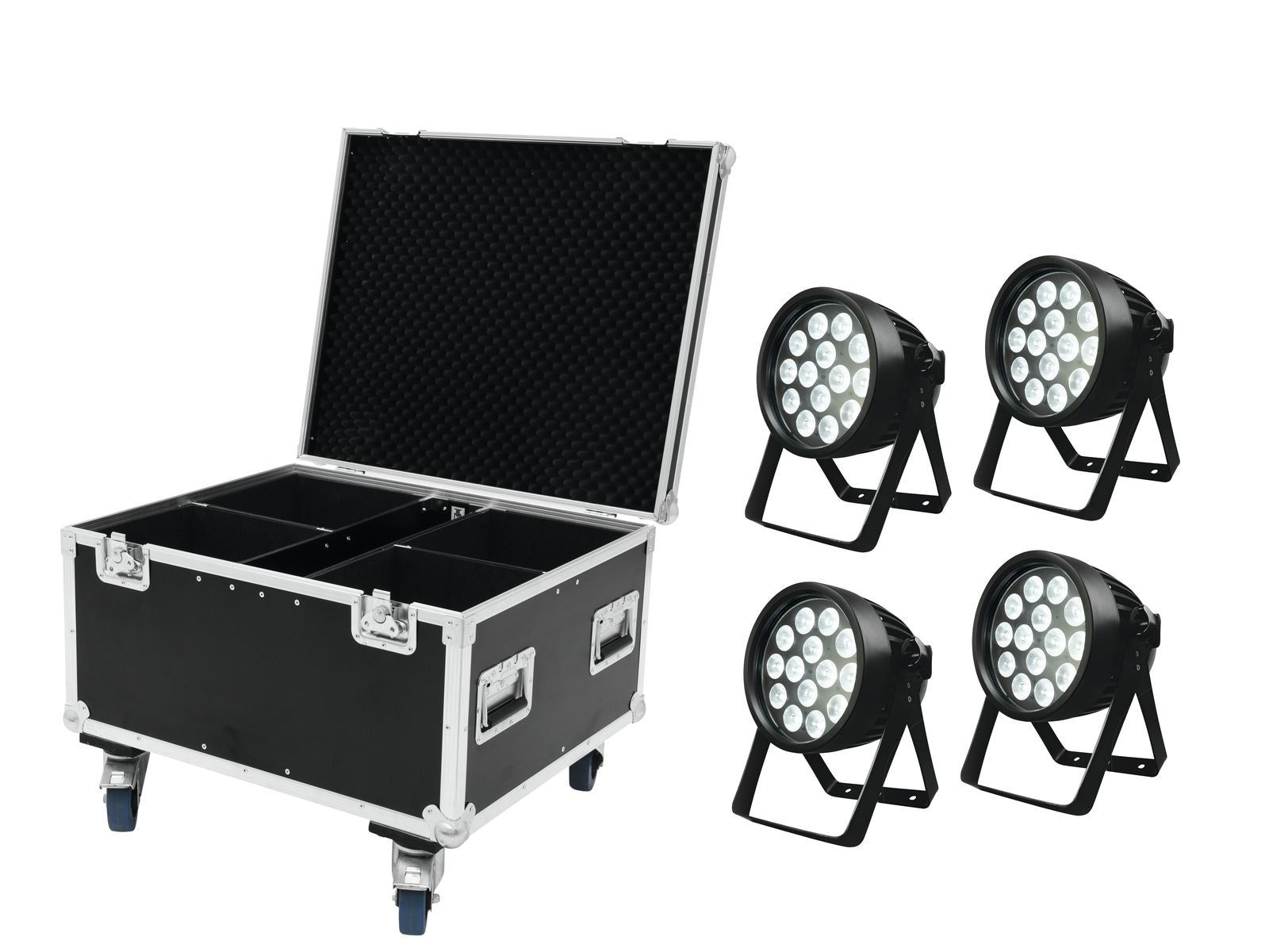 4x weatherproof spotlight with RGBW color mixing, diffuser discs and PRO flightcase with wheels