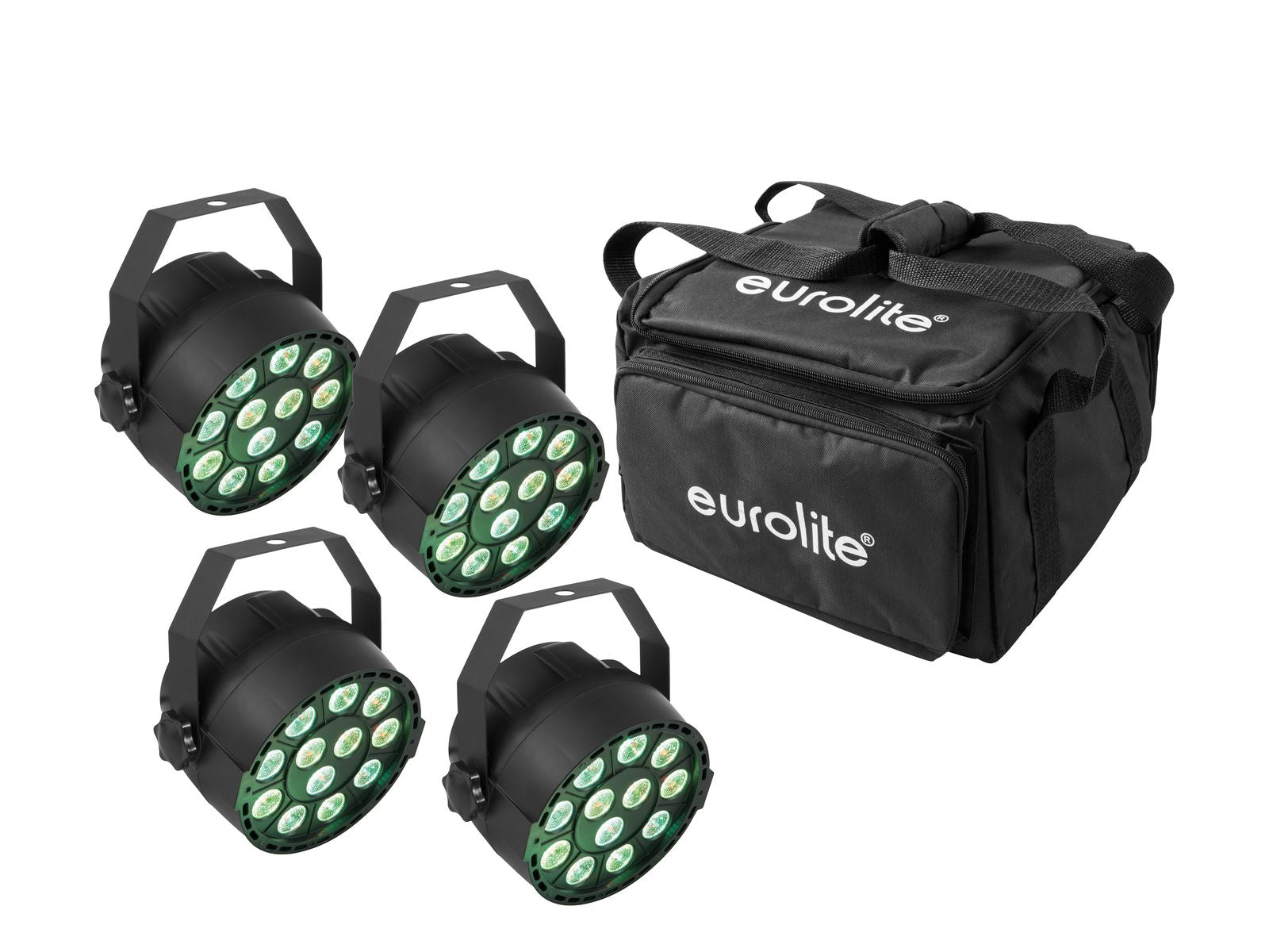 4x compact spotlight with 12 x 3 W 3in1 LEDs in RGB including black soft bag