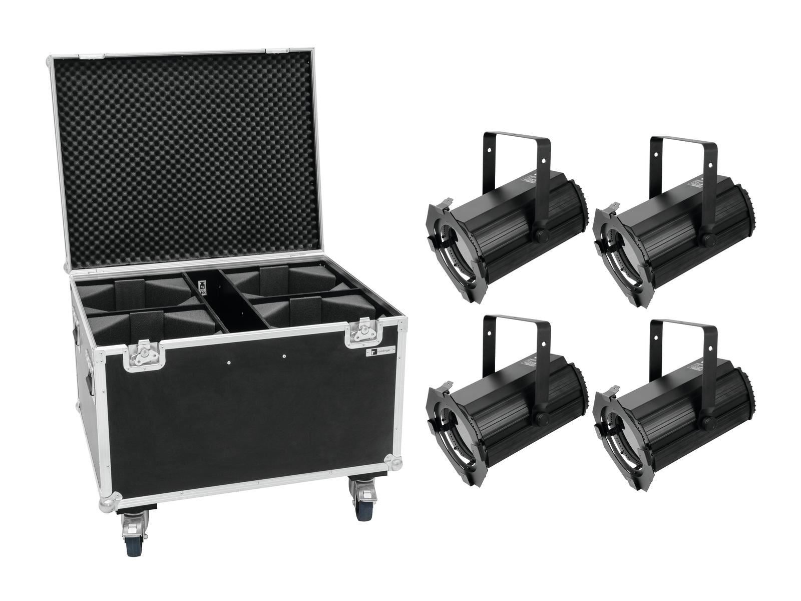 4x Fresnel spot, 100 W warm white LED, CRI >90, quiet, DMX including PRO flightcase