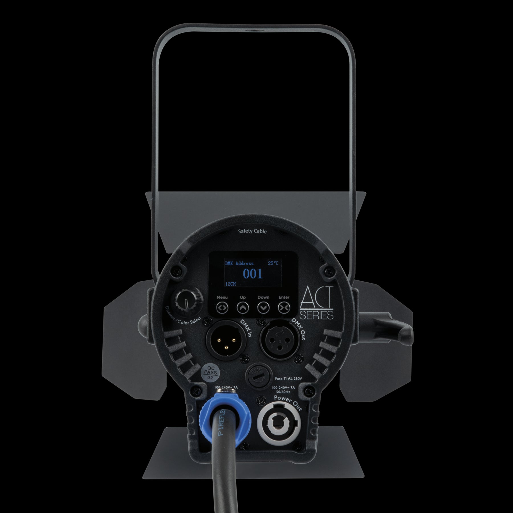 The Showtec ACT Fresnel 50 RGBAL is a compact 50-watt RGBAL COB LED Spot with high CRI (>93) and silent operation, suitable for theatrical applications, museums, and exhibitions. It uses a 150 W RGBAL light source to optimise the colour output, allowing you to create a wide gamut of colours while maintaining a high CRI. It projects a bright, soft beam of light within a wide, manually adjustable zoom range of 15°-35°. The ACT Fresnel 50 RGBAL can be controlled via DMX, RDM, and it is equipped with one knob for manual colour and dimmer control. It is supplied with a barndoor and filter frame, allowing you to shape its output.