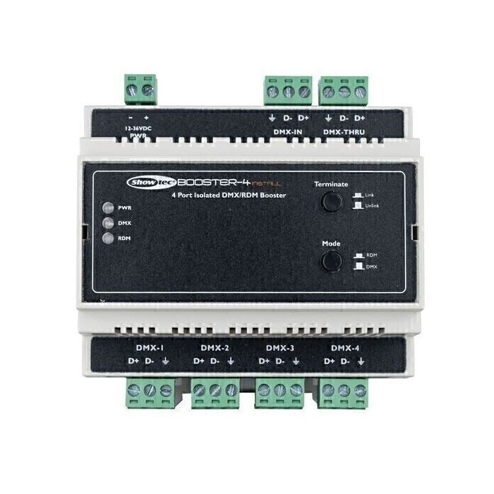 The Showtec Booster-4 Install is the ideal compact fixed-installation booster for you. All connections are easy connectable with the plug-in Phoenix terminals, and both inputs as all outputs are optically isolated to prevent any interference from getting hold of your signal. The din-rail mounted Booster distributes both DMX and RDM and is ideal for network system integration projects.