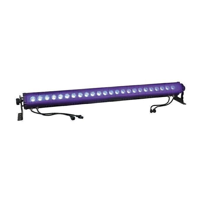 The Showtec Cameleon Bar 24/1 UV is a powerful 24x 2-watt UV LED Flood with silent, fanless operations and IP65 rating, suitable for indoor and outdoor applications. It has a 25 fixed beam angle and features 0100 % dimmer and 020 Hz strobe effects, perfectly suitable for colour mixing on stage. The Cameleon Bar 24/1 can be controlled manually, via DMX and Master/Slave in either Manual and Auto run mode. It comes with a dedicated IP65 power connector and bracket.