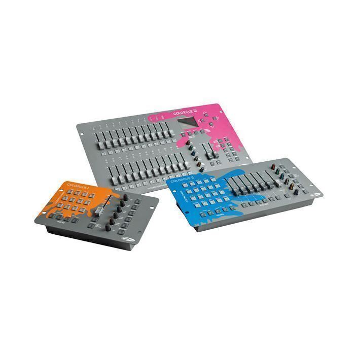 The ColorCue 1 offers one grandmaster fader with 6 colour rotary encoders, 12 memory buttons for colours/chases/user memories.