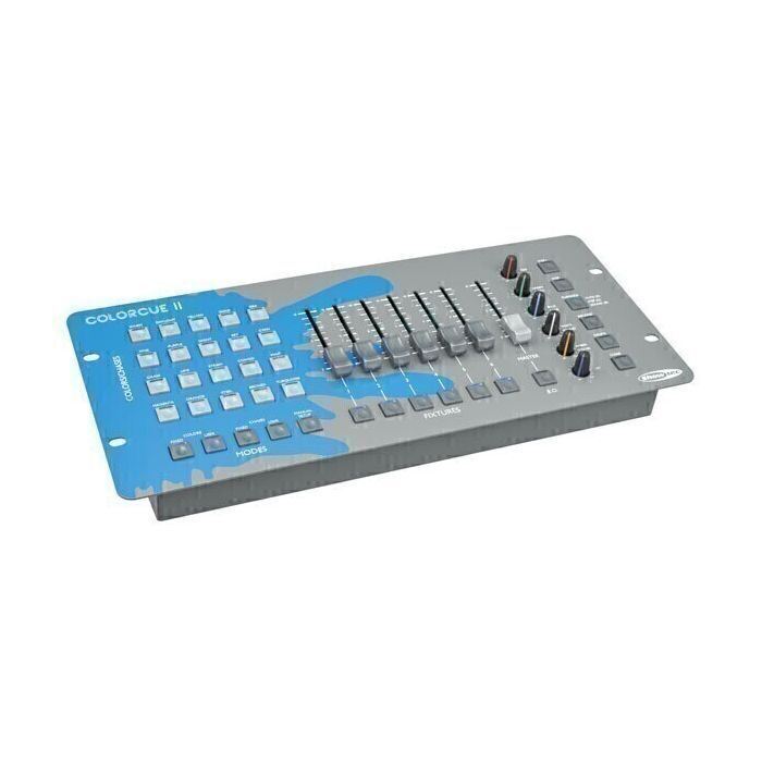 The ColorCue 2 offers one grandmaster fader, 6 fixture intensity faders, 6 colour rotary encoders, 20 memory buttons for colours/chases/user memories.