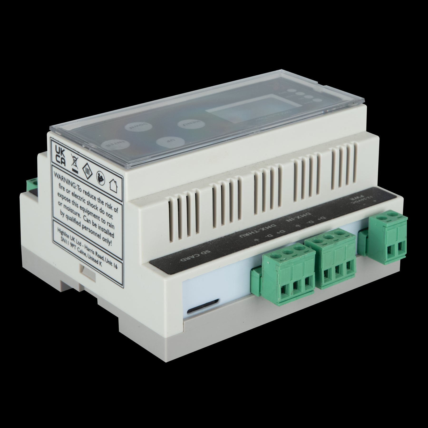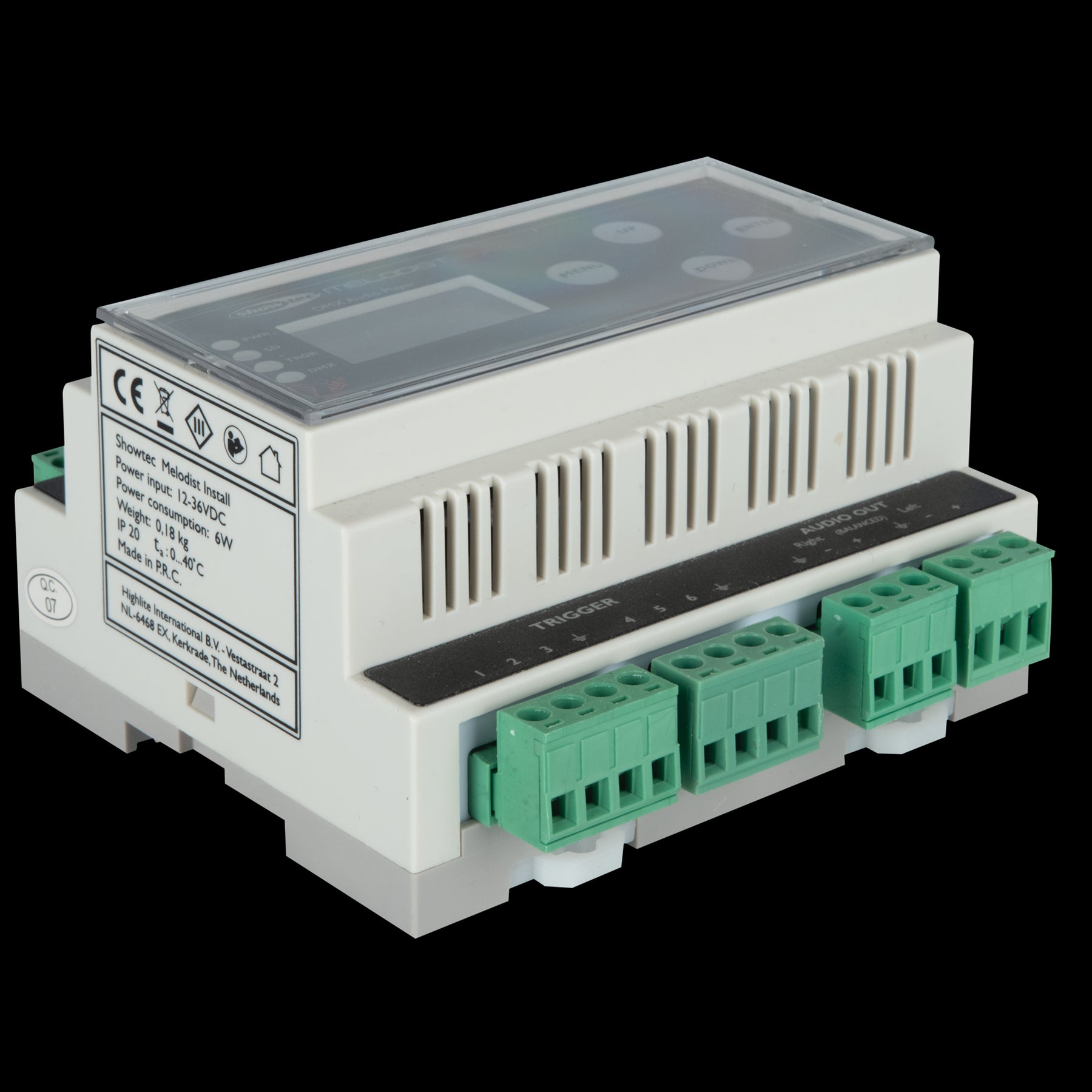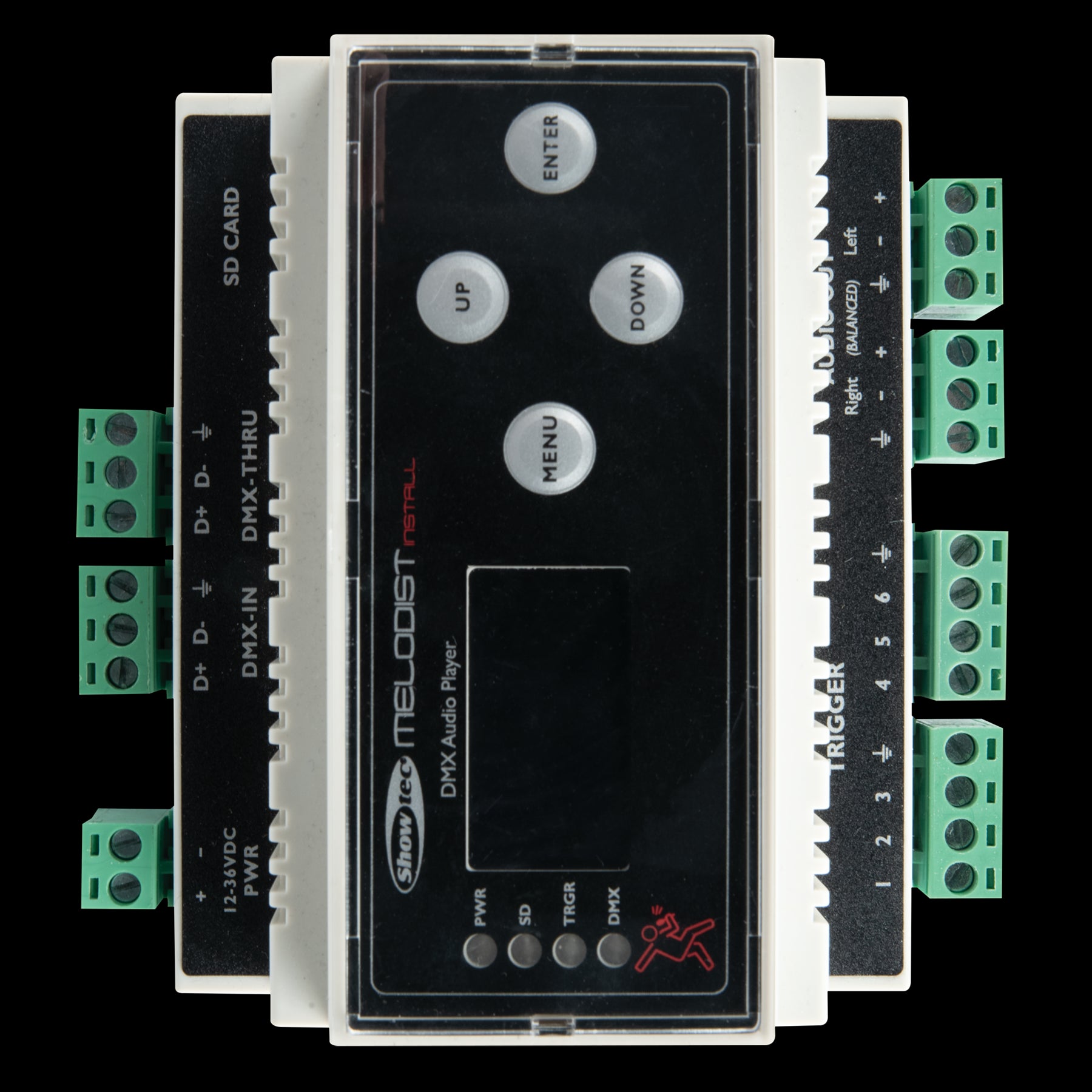 The Showtec Melodist Install is a DMX controllable WAV media player for DIN rail mounting. It plays stereo WAV files from a micro SD card via two balanced outputs. It has a trigger mode and a player mode. Settings and play modes can be adjusted using the front panel LCD and control buttons. Four status LEDs indicate the status of the player and control signals.