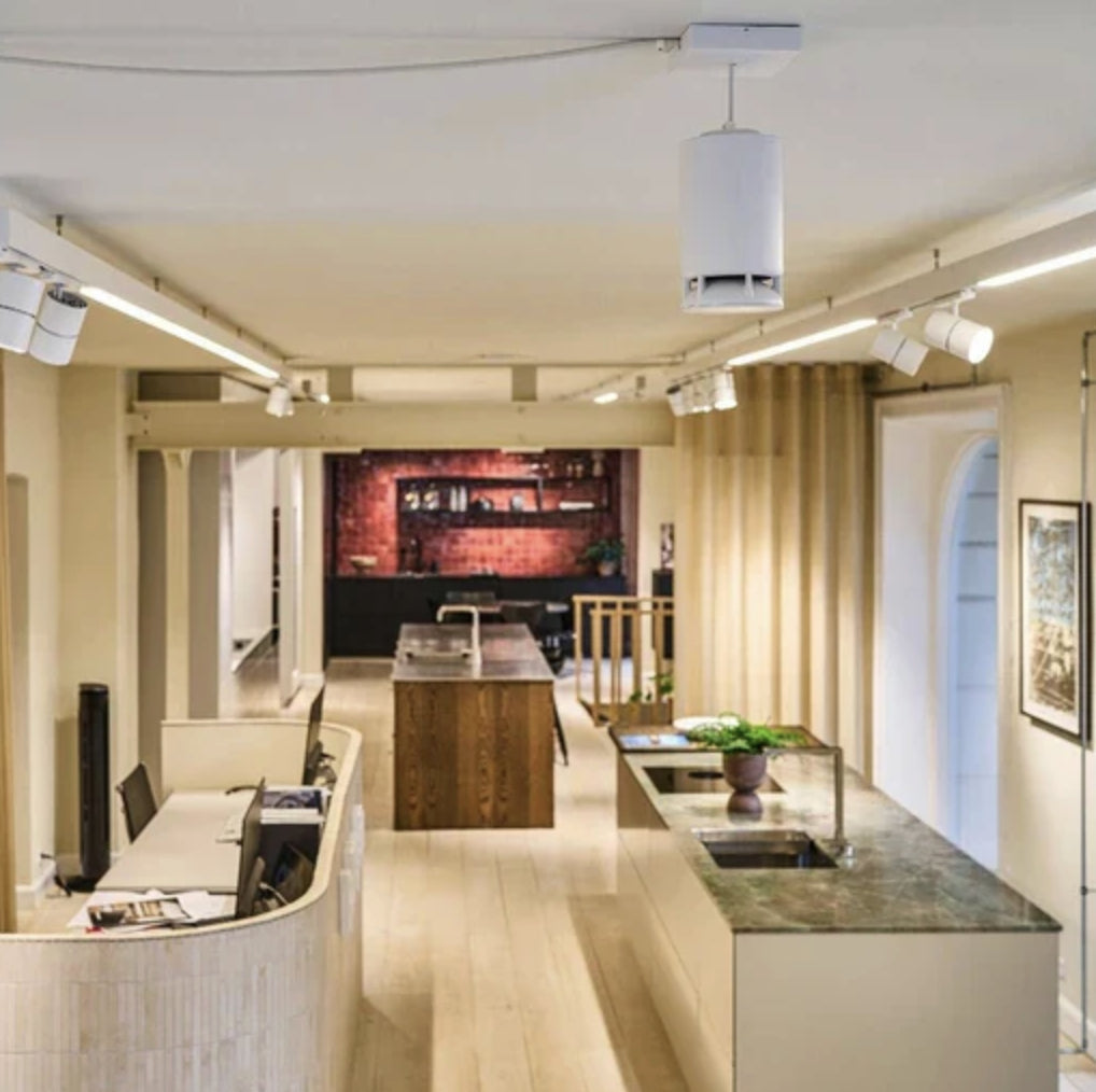 The Spottune OMNI Cord is a wireless, omnidirectional speaker designed for ceiling suspension, particularly suitable for environments with elevated ceilings. It is powered via a standard outlet cord.