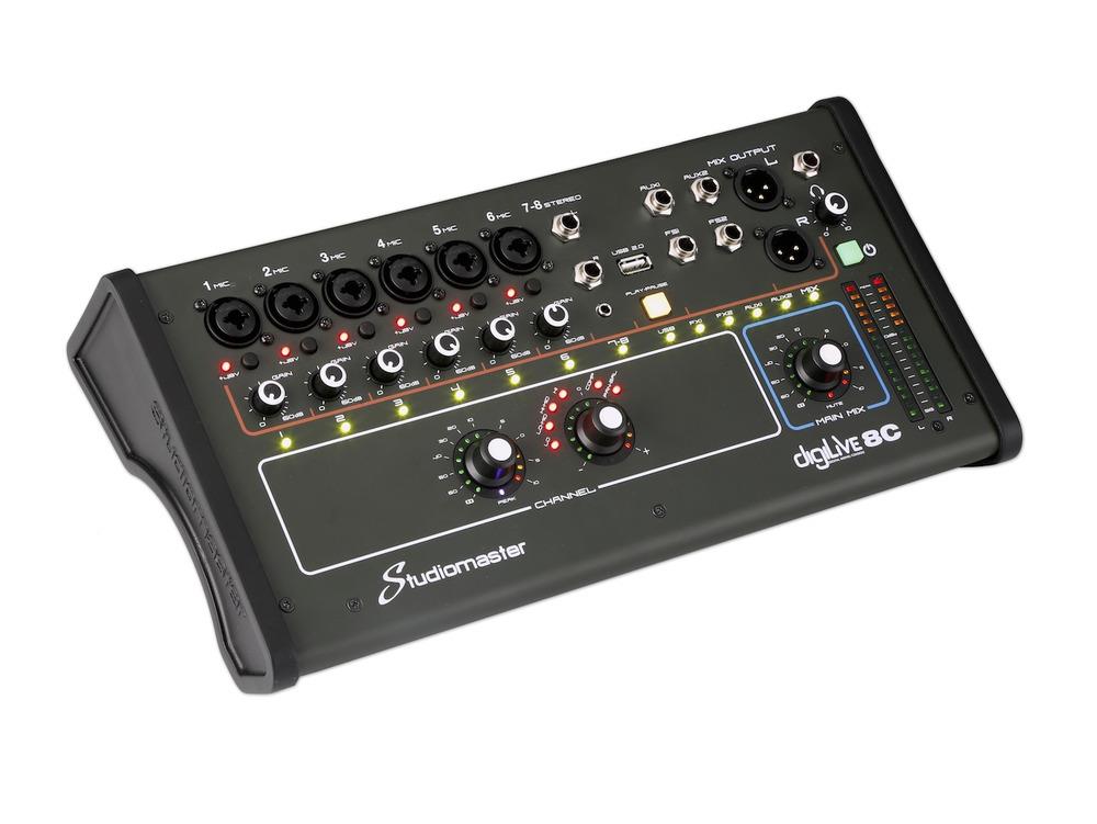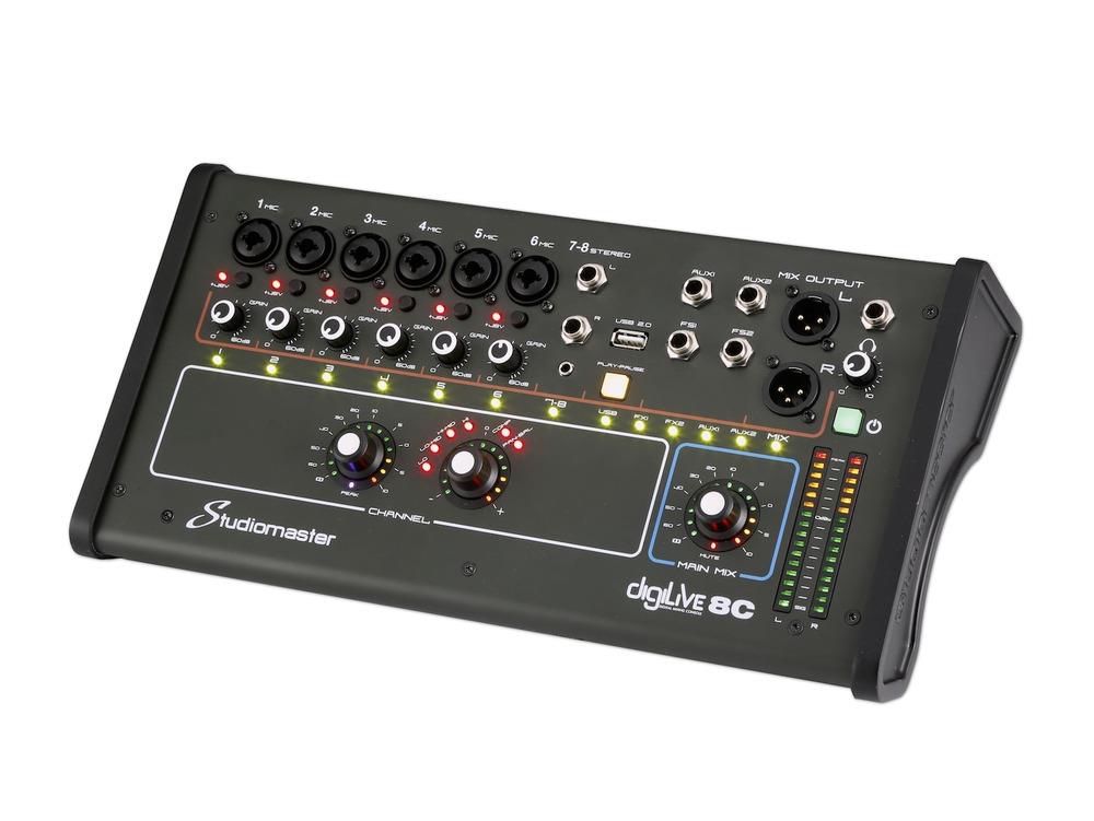 Ultra-compact professional digital mixing console with 8 analogue inputs, 6 mic inputs, and 1 stereo input.