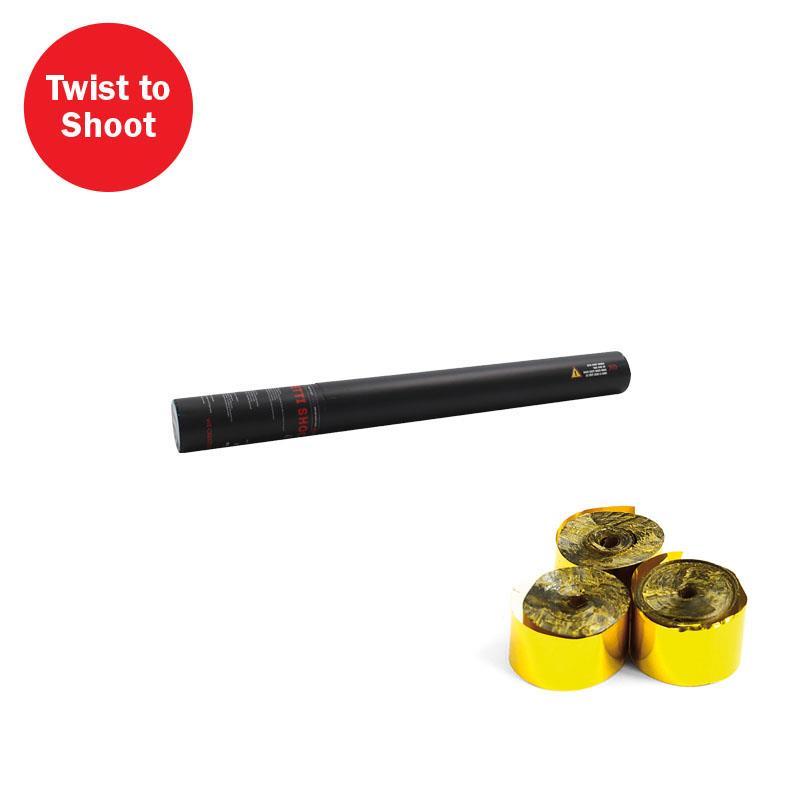 Handheld streamer cannon pre-filled with high quality gold metallic streamers.