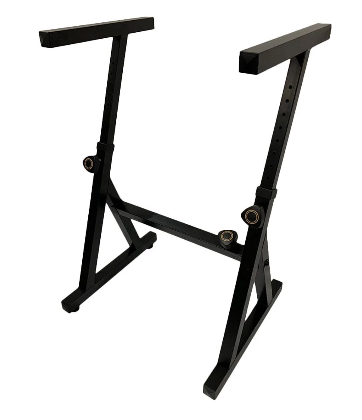 A heavy-duty keyboard/equipment stand designed to support most 88-key keyboards, flightcased CDJ/turntable/DJ mixer systems, and features separate height and width adjustment.