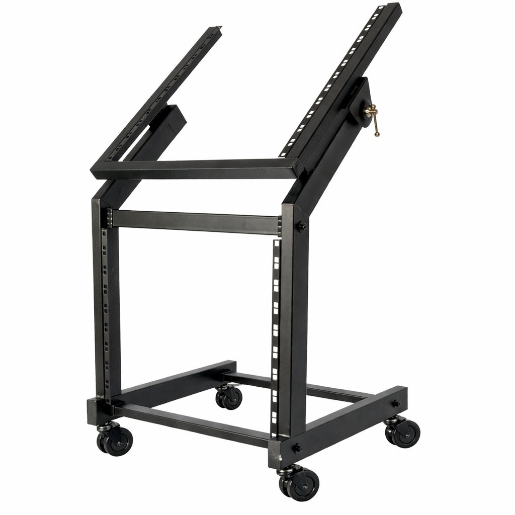 19" equipment rack for amplifiers, mixers, CD/DVD players and other 19" devices. The units are mounted on the upper tiltable or lower vertical frame. Suitable for mobile and fixed installations.