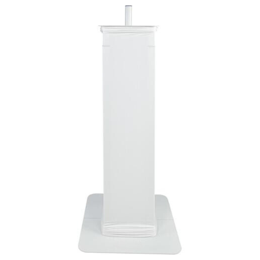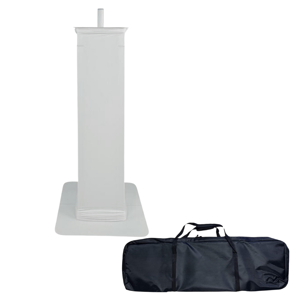 A sturdy 1.5M white podium stand for displaying moving heads, effects lights, monitors, speakers and more. Includes carry bags as well as a set of black and white lycra scrims.