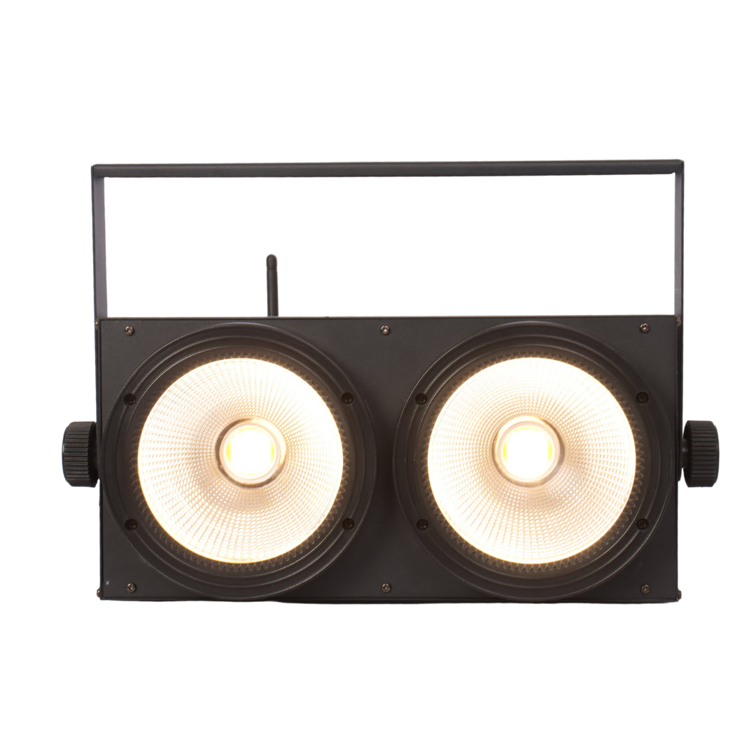 Introducing the Thor BoltBlinder 200W Blinder, a cutting-edge lighting fixture infused with advanced COB (Chip on Board) technology for exceptional illumination. This robust blinder showcases two 100W LEDs, each encased in a 60° reflector, generating a brightness comparable to a 1000W traditional lamp. The unit is built within a durable steel frame, ensuring lasting performance. User interaction is made easy with a 4-button control panel and a clear LCD display.
