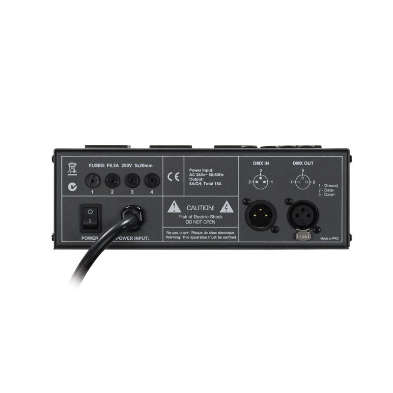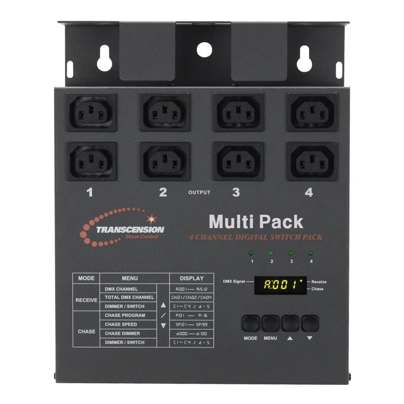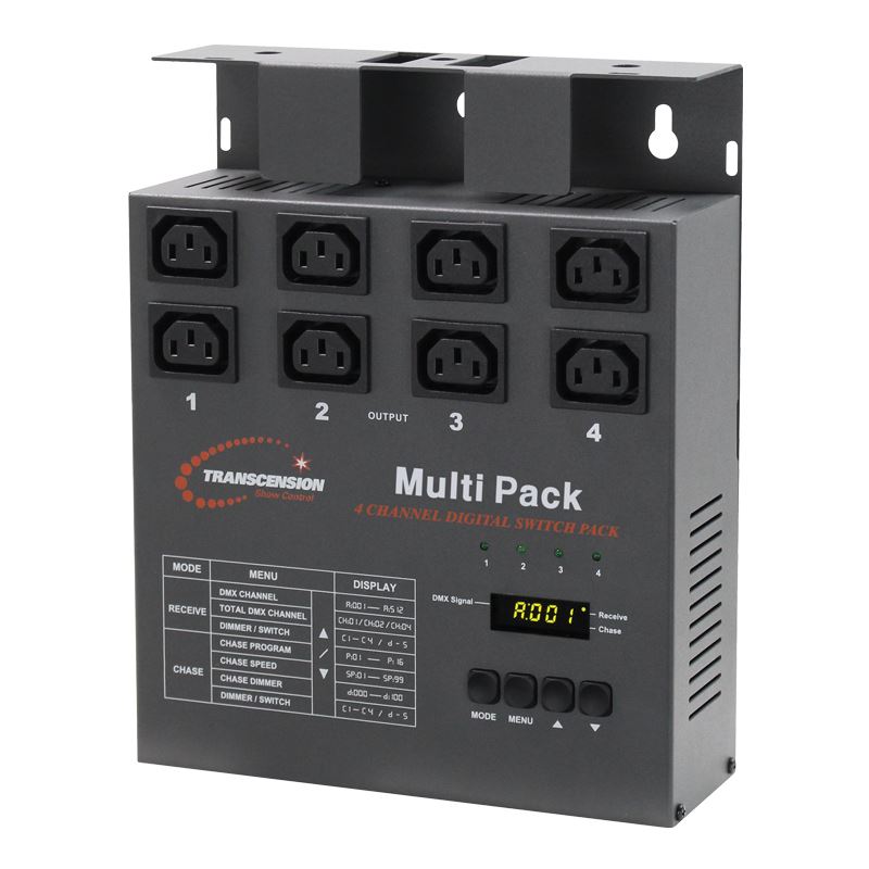 The Multi Pack is a 4 channel dimmer/switch pack with built-in dummy load circuit eliminating flicker when switching low power LED fixtures. With an LCD display the multi pack offers a full function professional performance for a varied and diverse DMX light show.