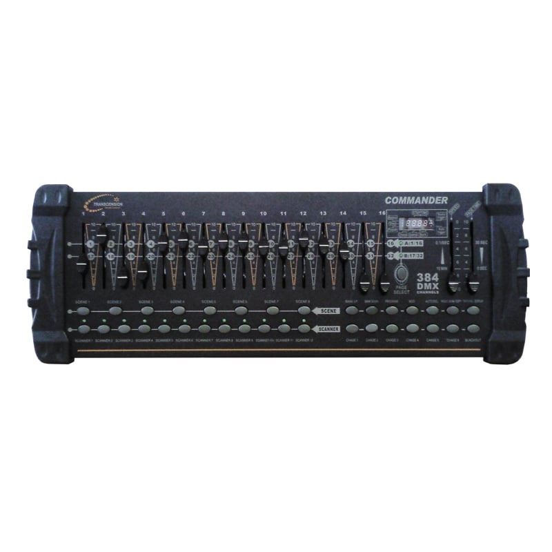 The Commander 384 is a universal intelligent lighting controller. It allows the control of 12 fixtures of up to 32 channels each and up to 240 programmable scenes. Six chase banks can contain up to 240 steps of the saved scenes and in any order. programs can be triggered by music,automatically or manually. All chases can be executed sequentially. The Commander 384 has the unique feature of returning to the last selected programme on power up, so it is ideal for a wide range of applications.