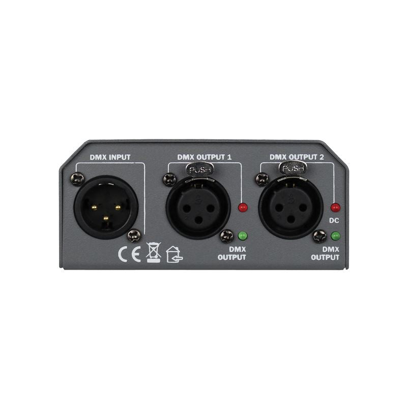 A combination 2-way DMX booster/distributor featuring one input and two outputs plus IEC power input and IEC power output. Both DMX input and DMX outputs are provided with 3-Pin XLR connectors, each DMX output has an independent driver.