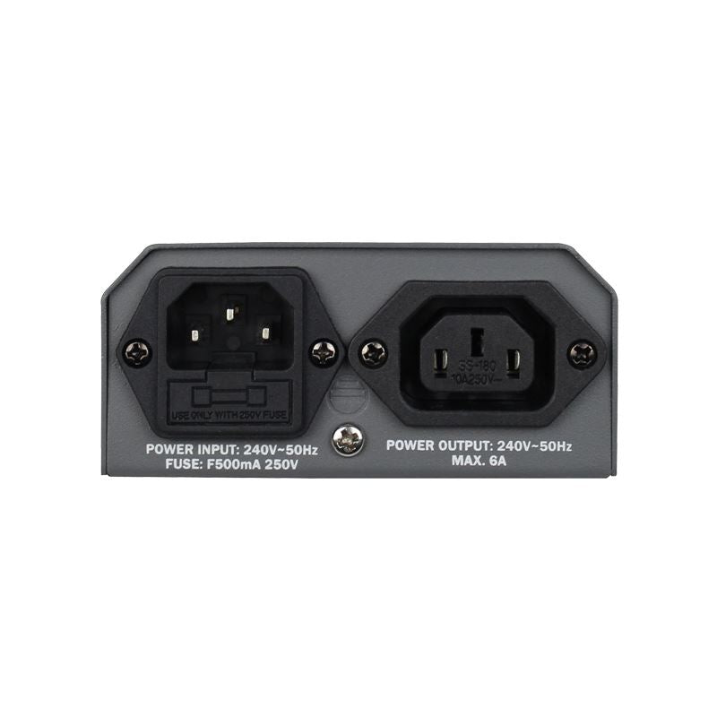A combination 2-way DMX booster/distributor featuring one input and two outputs plus IEC power input and IEC power output.