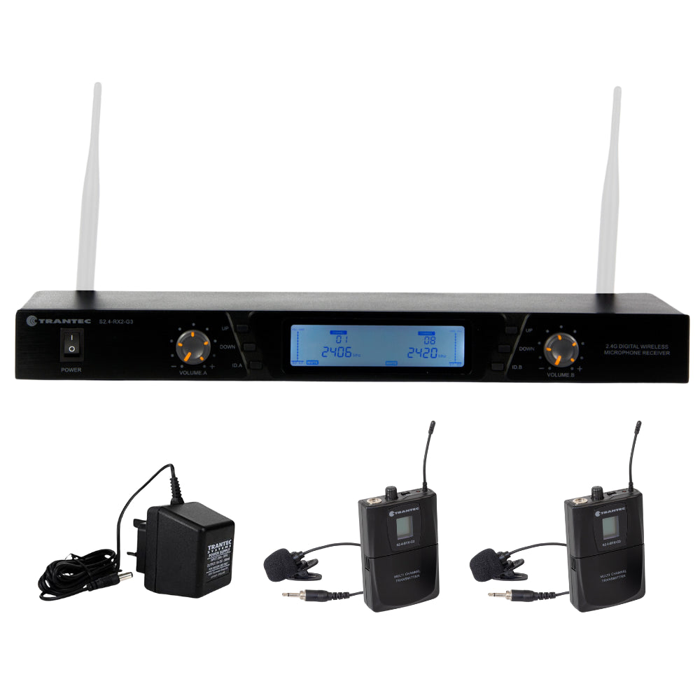 S2.4 series dual receiver wireless system with two belt pack transmitters and lapel mics