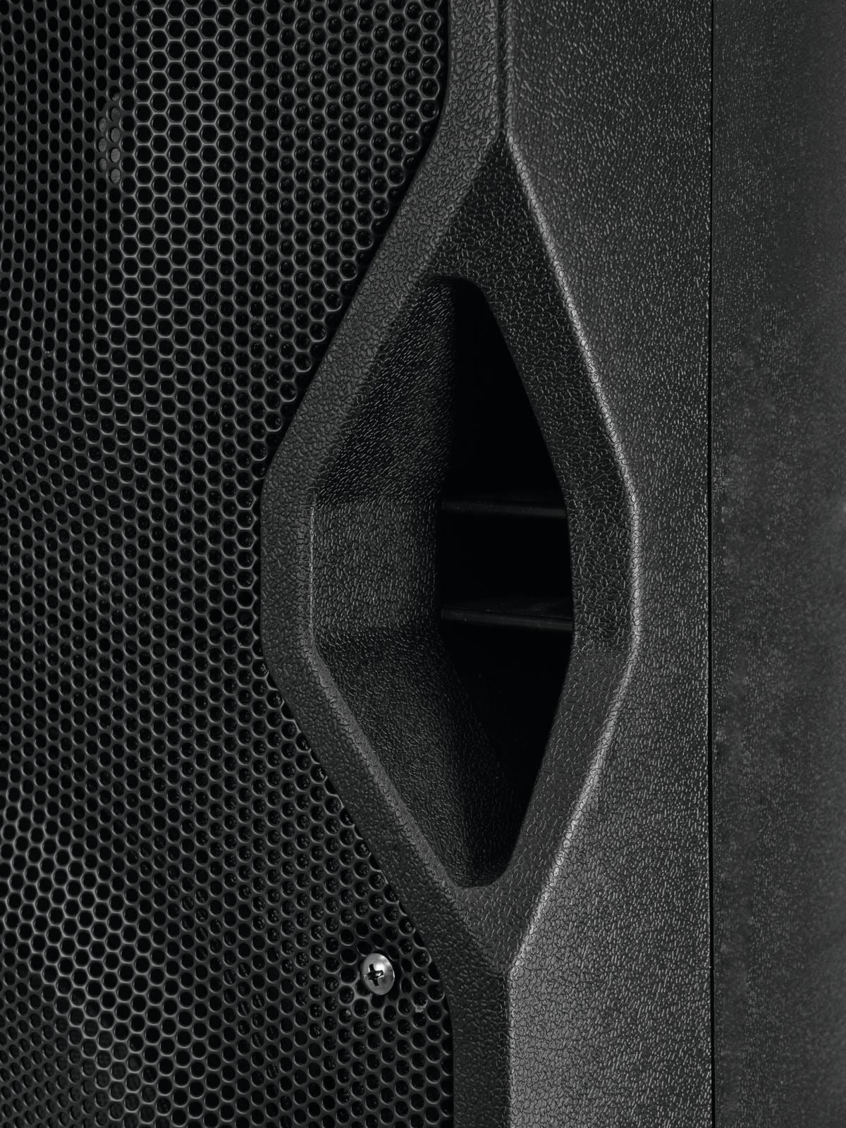 Speakers: | 1 x compression tweeter highs (1") approx 2,5 cm with neodymium magnet Voice coil compression tweeter highs (1") approx 2,5 cm Horn vent (1") approx 2,5 cm 2 x woofer (15") approx 38 cm with ferrit magnet Voice coil lows (2") approx. 5 cm |